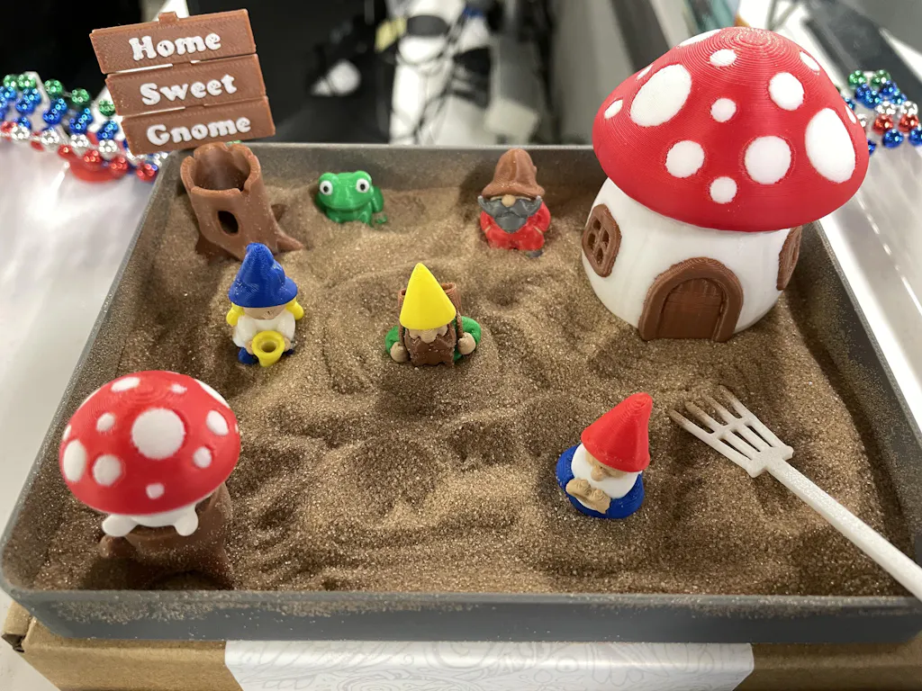Escape to enchanted tranquility in your own miniature Gnome Zen Garden! Colorful gnomes gather around a charming mushroom cottage, “Home Sweet Gnome” sign, tree stumps, and rake set in rich brown sand. Swirl peaceful patterns and rearrange the scene for cozy fun. The ideal desktop retreat for gnome fans, garden lovers, or a whimsical gift they'll adore! 🍄🧙🌿